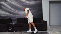 Elly Clutch conhece seu vizinho e o convida para tomar um café. Ela vai atender a um telefonema e sua irmã gêmea malvada aparece para chupar e foder seu grande pau preto.