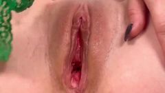 Tem o corpo nu e cheio de óleo, e para se excitar de uma forma diferente, mete pela cona várias peças de roupa interior coloridas.