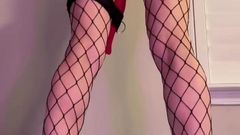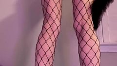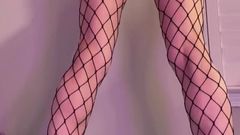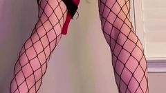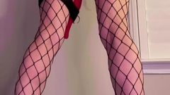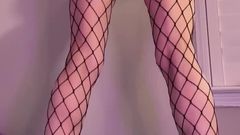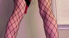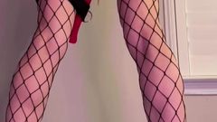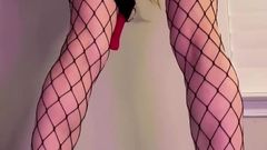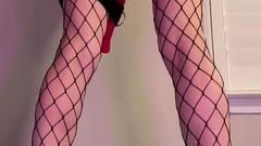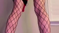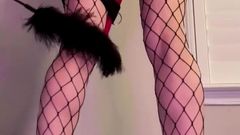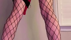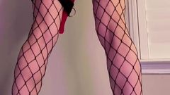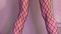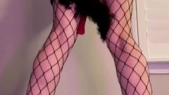 A loira está de pé com um brinquedo enorme enfiado em sua buceta e seu parceiro a chicoteia para fazê-la gozar mais. Você pode ver que ela gosta de receber cócegas.