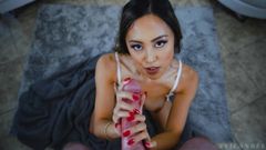 Uma linda morena em uma bela lingerie cuida do pau de um garanhão com sua boca. O pau fica vermelho de prazer antes de explodir em seu rosto.