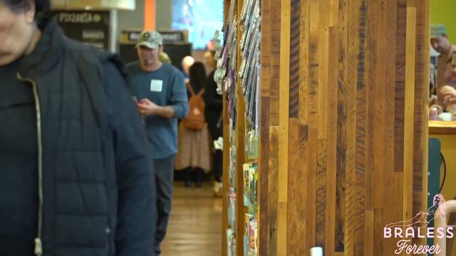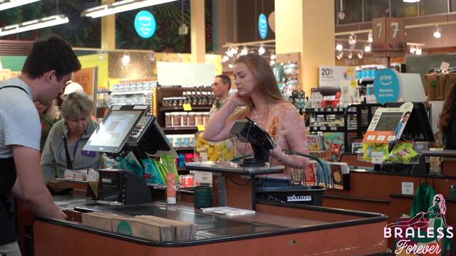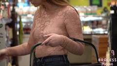 É possível ver seus seios através da blusa quase transparente que ela está usando. Ela é uma exibicionista e é por isso que gosta de fazer compras assim, sem problemas.