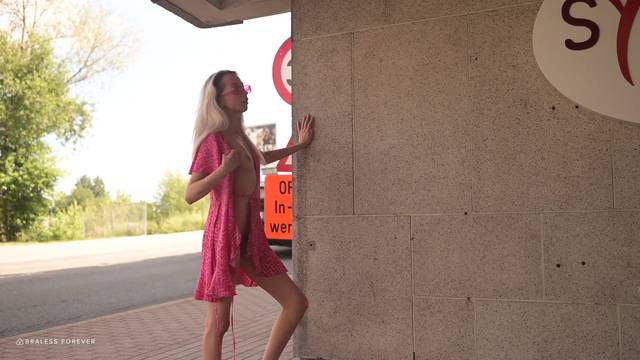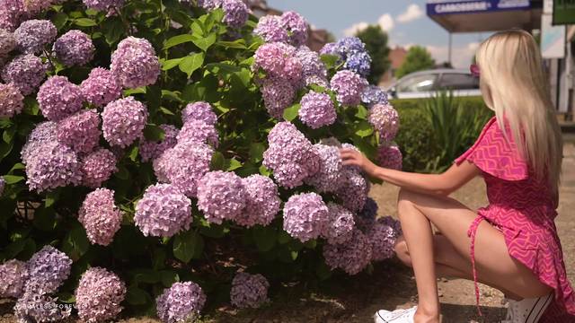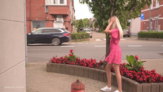 Bernie está feliz com seu corpo, apesar dos peitos pequenos e da buceta apertada, ela os mostra livremente enquanto caminha ao sol.