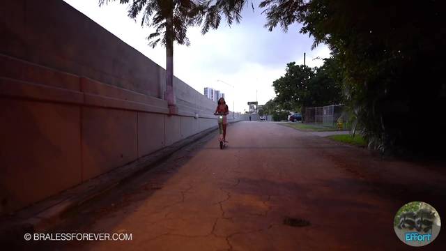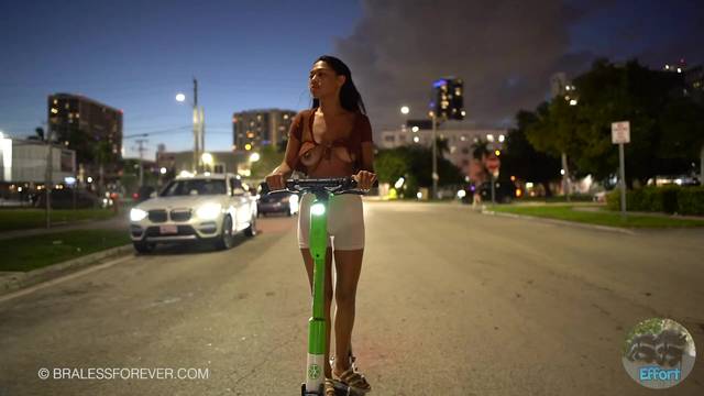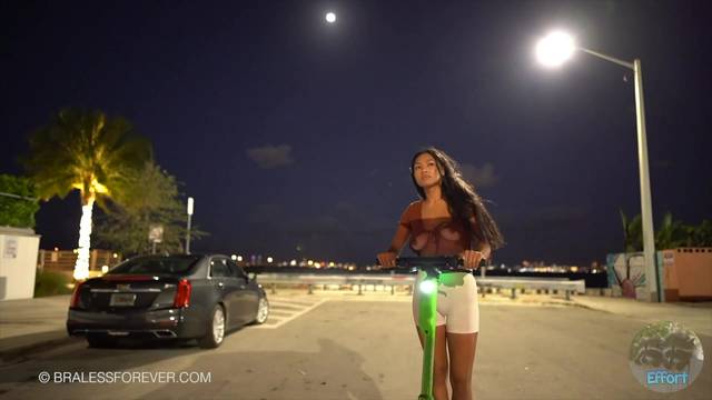 À noite, ela usa seu skate para mostrar seus peitos na rua.