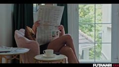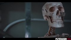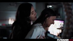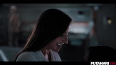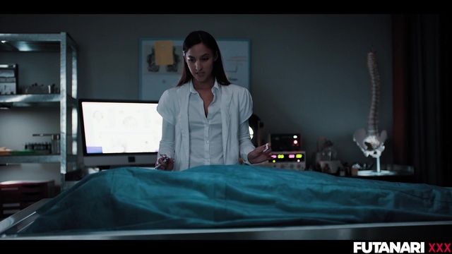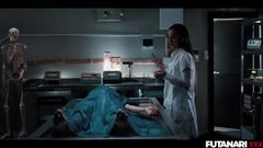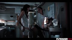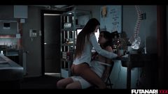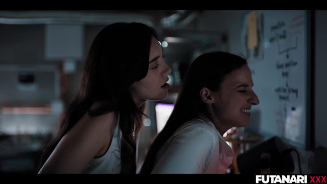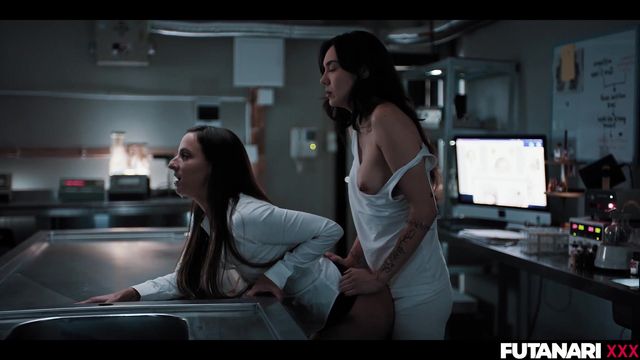 Catherine tem uma pica dura, criada por Adara para encher sua garganta e sua cona escorrendo sobre a mesa de laboratório, terminando em peles brilhantes de suor.