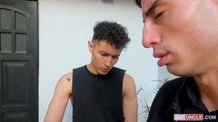 Jóevnes latinos gays fazendo um trio com o vizinho no pátio