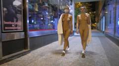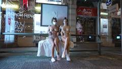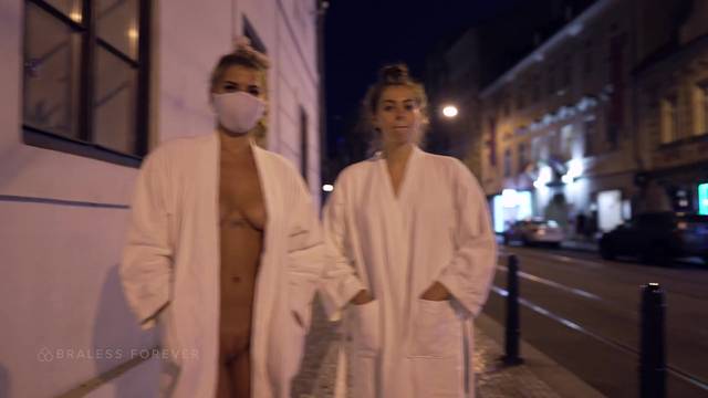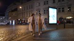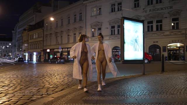Duas primas saem nuas para caminhar pelas ruas para nos desafiarem