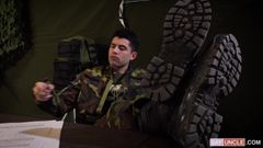 O sargento surpreende seu subordinado usando sua jaqueta e sentado em sua cadeira, então como castigo, ele deve se ajoelhar e chupar o pau como uma garota!
