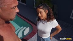 Isabella Jules surpreende seu padrasto Peter nu à beira da piscina, maravilhada por sua grande pica. Ela o masturba e o chupa, mal cabe em sua boca.