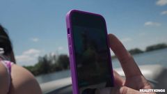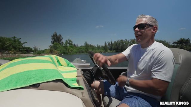 Jade Green se excita no barco de Mick Blue, enquanto ele tira fotos e a unge com óleo. Depois, ela se faz meter os dedos na buceta.