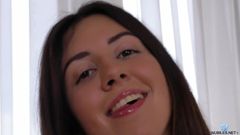 Katty mostra suas tetas brancas contrastando com sua pele bronzeada, abre as coxas para nos mostrar sua buceta raspada e desliza seu dildo em sua bucetinha apertada!
