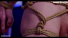 Leo Marco amarra Jeff Pesos com cordas, deixa chupar o pau antes de arrombar o cu e a boca dele em uma cena de sexo anal hardcore e sem camisinha.