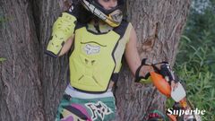 Despe-se perto da sua moto, mostra a sua cona depilada e corpo perfeito durante um piquenique onde vão querer devorá-la inclusive sobre a sua moto!