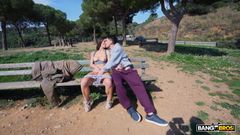 Calita Fire mostra suas belas tetas naturais e sua buceta peluda em uma montanha de Barcelona. Papi Rodriguez chega e tira seu pau para ela!