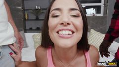 Nuria Millan sacode sua grande bunda, deixa que unte óleo nos seios e depois toma as grandes picas de Christian Clay e Freddy Gong em todas as posições.