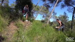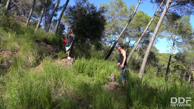 A peituda Briana Banderas toma sol nua na floresta. Quando cheira a fumaça de uma fogueira, vai até lá e conhece um lenhador que a fode ao ar livre!