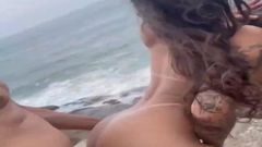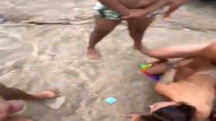 O melhor que aconteceu a esta latina transexual ao ir à praia foi encontrar vários homens que a foderam em gangbang até gozarem no seu rosto.
