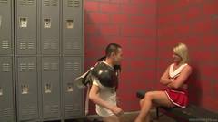 Esta aluna loira estava no vestiário sozinha, até que um cara chega e quer tirar proveito de sua solidão mas, dentro de momentos, ele não vai ser o único a querer transar com ela e transformar sua solidão em um guloso gangue bangue!