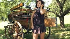 Esta mulher fica extremamente excitada por apenas sentir o cheiro de grama no campo e fica muito mais animado com o antigo vagão de madeira...