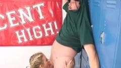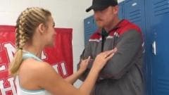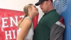Esta loira bonita não quer ser punido por seu treinador escola para tentar fugir dela, dando-lhe um bom boquete para tentar fazê-lo esquecer seu mau comportamento.