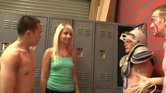 Esta porno star loira fica nua no vestiário e estes homens ficam animados quando a vêem e transam com ela no chão.