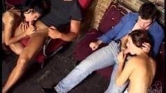 Aqui estão algumas mulheres muito excitadas que fodem como nunca antes com esses dois homens tesudos, em uma mini orgia que se organiza entre eles, e você não deve perdê-la!