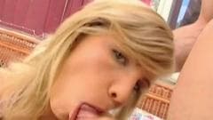 Esta loira tem um bichano apertado e hoje ele recebe uma boa foda no sofá enquanto suas tetas saltam antes de sentir o rosto cheio de esperma.