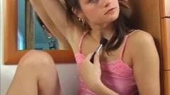 Essa jovem morena está tocando em sua buceta na frente da câmera e seus dedos tornam aquela buceta rosa bem molhada.