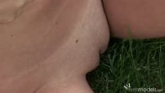Esta bela jovem morena vai dar um passeio no jardim, quando ela decide parar para tirar a roupa e se masturbar no gramado...