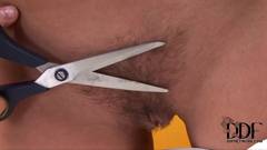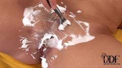 Esta loira sexy tem uma buceta muito peluda e agora quer mantê-la arrumada e suave novamente, por isso ela raspa tudo revelando o seu pequeno e perfeito bichano.