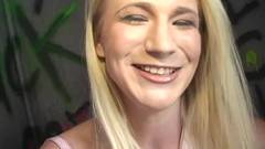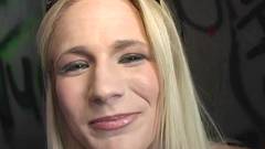 Essa loira safada está chupando pau através de um gloryhole em um banheiro nojento, mas ela não se importa porque ela só quer ter a boca cheia de pau!