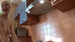 Esta loira safada está coberta de sêmen e está sendo perfurada por seu vibrador na cozinha, ajudada pelo namorado, antes dele enfiar a mão inteira na sua buceta!