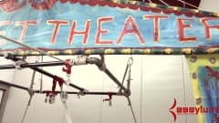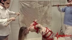 Esta rapariga vai ser amarrada e presa por dois mascarados que vão suspendê-la tratá-la como uma marionete ...