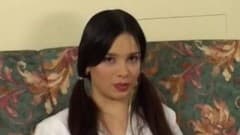 Esta jovem morena está fazendo seu primeiro trio com um amigo e seu pai.