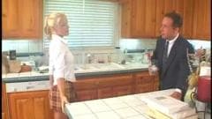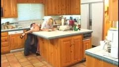 Ela encontro-o na cozinha e oferece sua buceta para ele em troca de dinheiro, que ele obviamente aceita e eles fodem na bancada da cozinha.