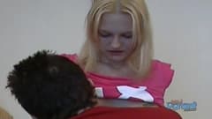 Esta puta loira quis foder com esse nerd, mas hoje ela só brinca pagando um boquete pra ele e ele goza em sua boca...