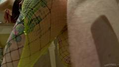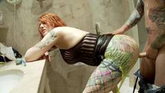 Essa cadela ruiva se ferrou no banheiro com dois homens que empurram seus paus em sua garganta e em sua buceta com força!