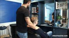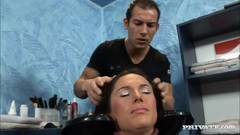 Ela vai começar arranjando o seu cabelo mas o cabeleireiro oferece um serviço de foda de rabo e goza dentro dele para ver o esperma escorrer...