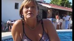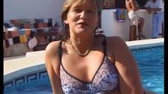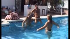 Mientras esta morena toma el sol en la piscina, llegan dos vecinos que saben muy bien lo que van a hacer y la penetran con sus pollas para complacerla