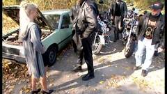 Christina Blonde está só no meio de tantos gajos e vai ter que obedecer aos seus caprichos. Vais adorar esse momento em grupo com este bikers.