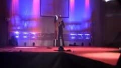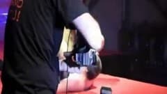 Este sortudo espectador é trazido ao palco durante este espetáculo e fica com um dildo preso na boca no qual uma morena está pulando