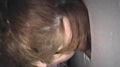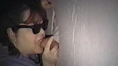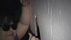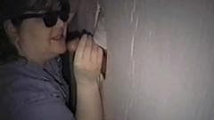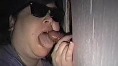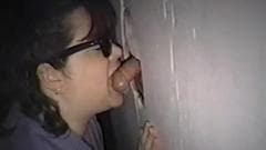Um pinto sai pra fora de um buraco na parede, e esta mulher de óculos não resiste, ela quer sentir essa pequena salchicha ejaculando em sua boca!