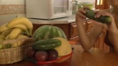 Desfruta de duas jovens lésbicas que sabem apreciar os vegetais! Elas vão brincar com eles colocando-os dentro das suas bucetas e se masturbando!