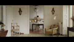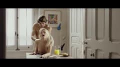 Este casal acaba de acordar. Ele vai preparar um pequeno almoço consistente quando a namorada chega toda feliz para anunciar que está gravida.