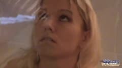 Esta menina loira quer saber o que se sente ao foder com um homem velho então ela seduz esse cara no banho, chupando o pau e transando com ele.
