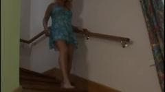 Esta mulher anda com tanto tesão que quando se encontra com um sextoy nas mãos só lhe apetece masturbar-se e não importa que seja nas escadas.
