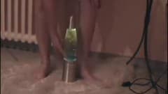 Esta mulher esqueceu de comprar um novo dildo e quer se masturbar. Assim, ela usa uma lâmpada para se penetrar nela.