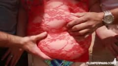 É por isso que ela seduz dois de seus vizinhos no pátio hoje! Ela deixa-os todos muito animados e pronto para uma boa foda!