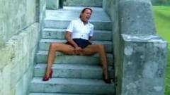 Esta mulher francesa quer se masturbar e o único lugar onde ela pode estar completamente sozinha e em privado é aqui nos degraus.