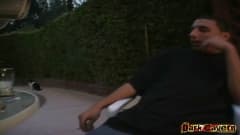 Um casal convida amigo preto a casa e enquanto um está bem estendido no sofá, ela vai ter com o preto na cozinha para lhe chupar a verga.