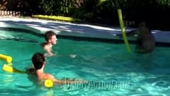 Três homossexuais desfrutam o seu tempo juntos a lamber e chupar pau antes de sodomizar à beira da piscina. Assista.